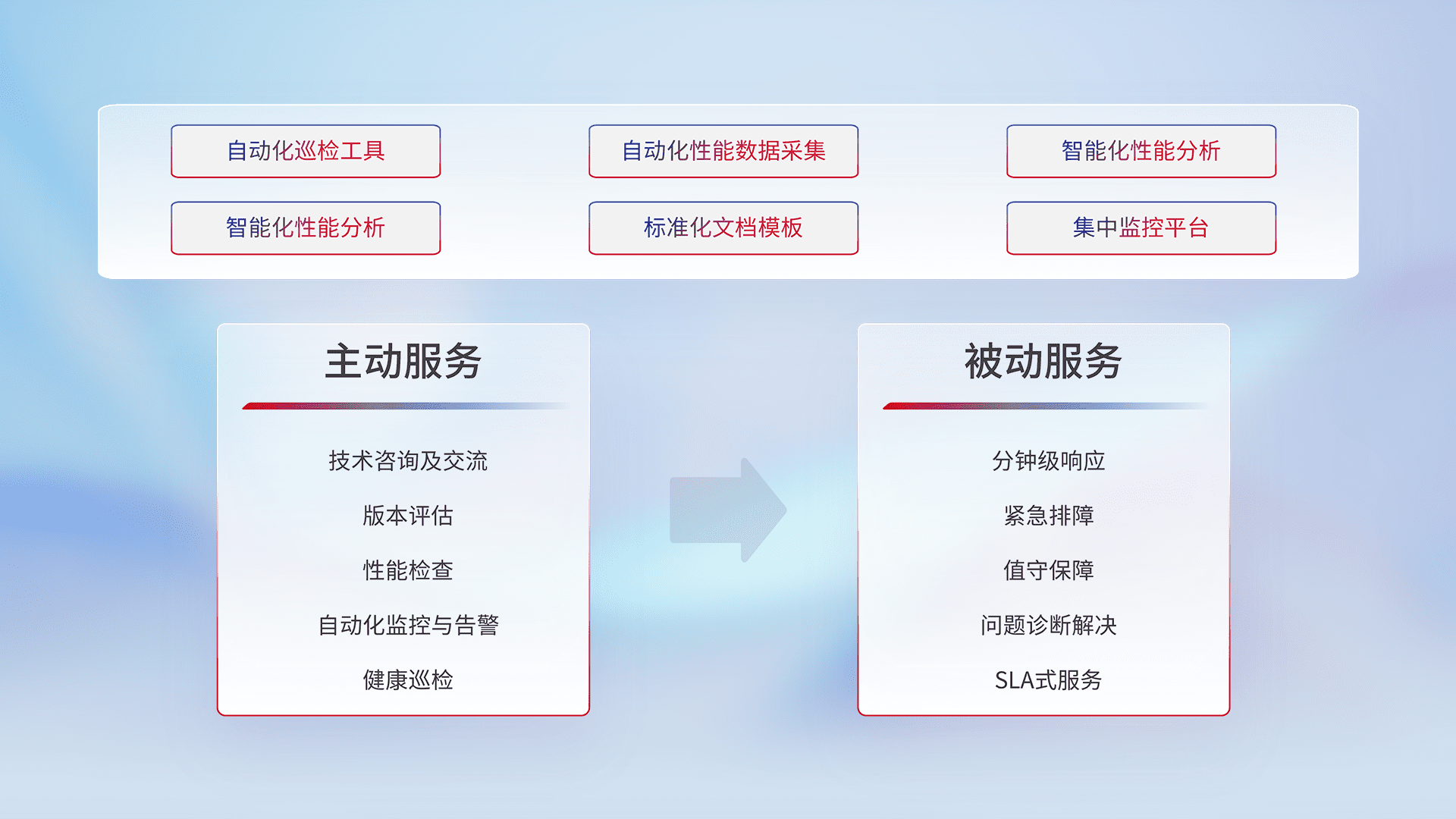 智能化工具和标准化文档,,,,保障服务质量,,,,提供主动服务(包含技术咨询、、版本评估、、、、性能检查、、、自动化监控与告警、、健康巡检)和被动服务包含(分钟级响应、、紧急排障、、值守保障、、、问题诊断解决、、、SLA服务)。。。