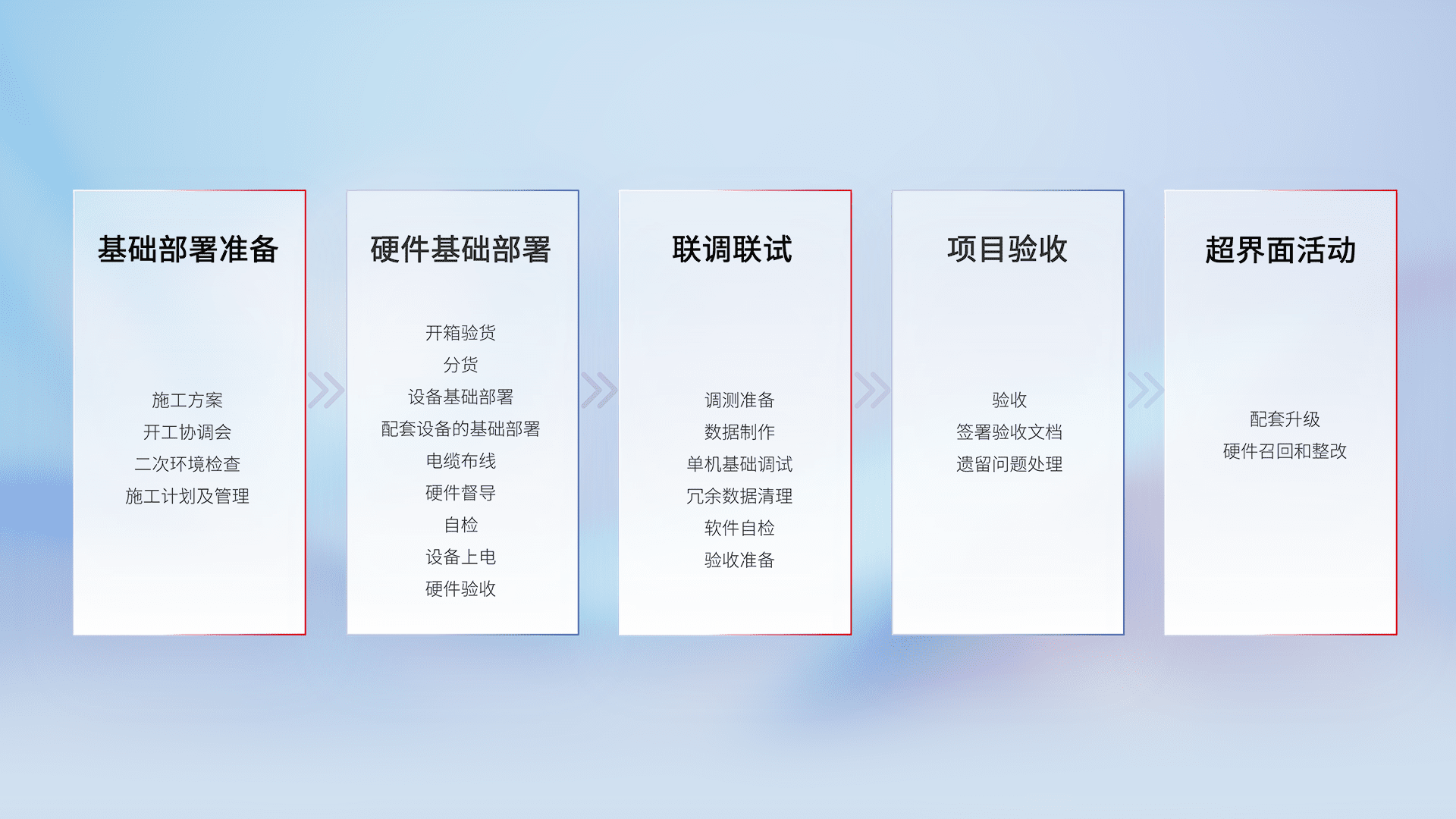 从基础部署准备、、、、硬件基础部署、、、联调联试、、项目验收、、、越界面活动的全过程可追溯,,,,保证施工质量和进度。。。